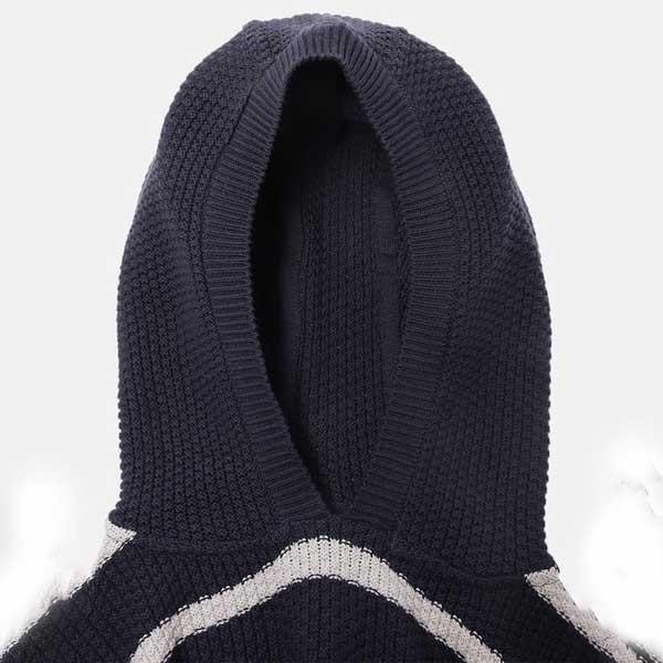 - Navy Blue and Grey striped pullover sweater, has a hood, long sleeves, 1 kangaroo pocket and ribbed hem