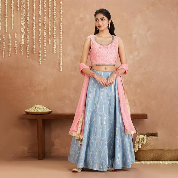 Gajra Gang by Nykaa Fashion Bani Pink and Blue Crop Top With Skirt and Dupatta