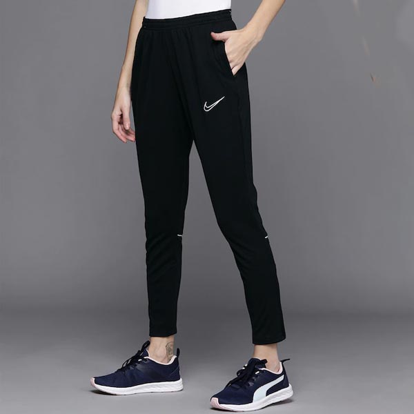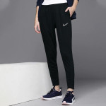 Black solid mid rise casual track pants, regualr length, zip hem, brand logo on left thigh.
