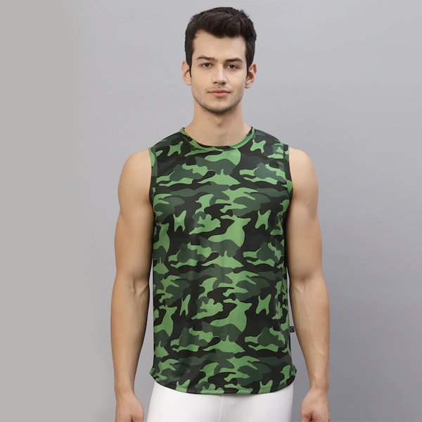 Men Green Camouflage Round Neck Sleeveless Activewear T-Shirt Vest