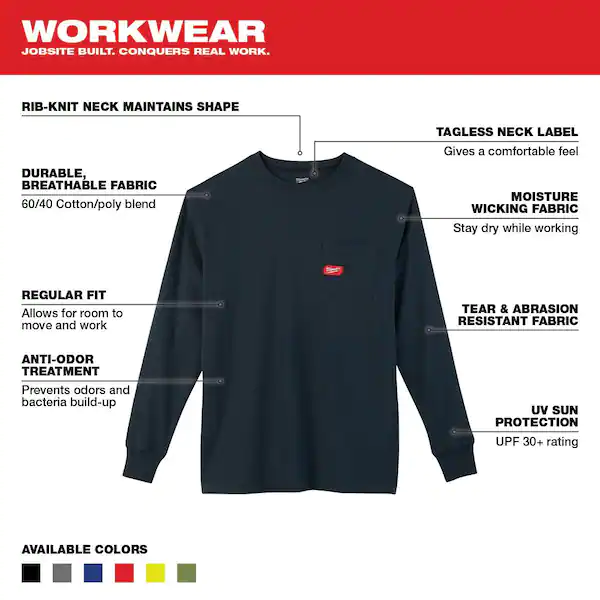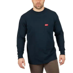 - The Milwaukee Blue Long Sleeve Heavy-Duty Pocket T-Shirts are made from durable, breathable fabric for all-day protection to outlast the job. Built with a tear- and abrasion-resistant 60/40 cotton/poly blend, these long sleeve t-shirts allow users to work hard without compromising comfort. When long days and tough conditions are the norm, users can rely on Milwaukee Heavy-Duty Pocket T-Shirts for comfortable durability that survives every jobsite. A moisture-wicking treatment makes these t-shirts great for the most demanding conditions. Get the perfect fit with t-shirt sizes ranging from small to 3X.