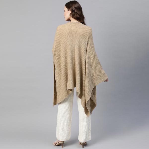 Beige solid open front longline shrug ,has long sleeves, asymmetric hem